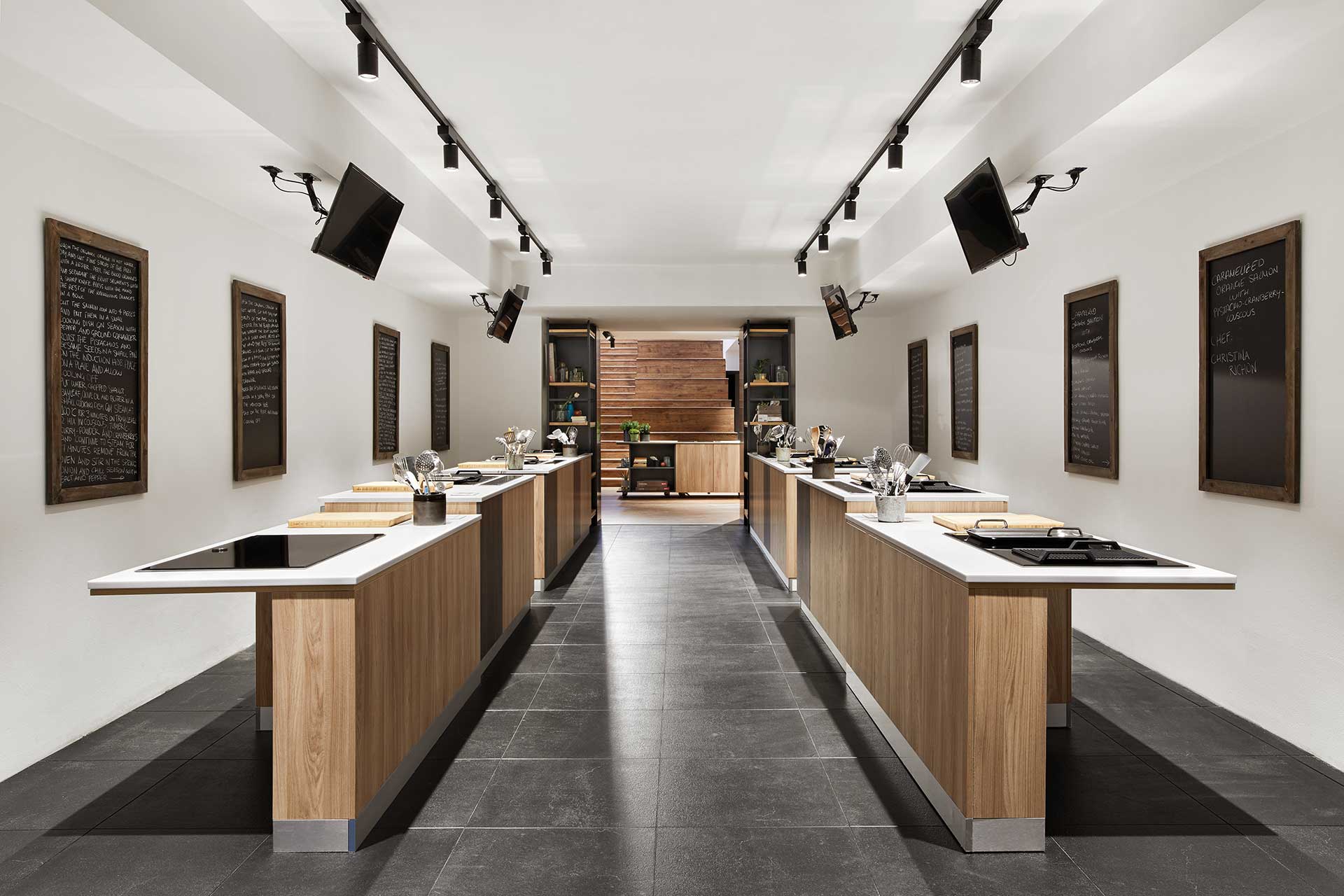 La Scuola di Cucina di DesignElementi è un luogo creato per mettersi alla prova in una delle otto postazioni completamente accessoriate con prodotti NEFF. Forno, piano cottura a induzione e cappa telescopica sono a disposizione di ogni partecipante per sperimentare e divertirsi in cucina.